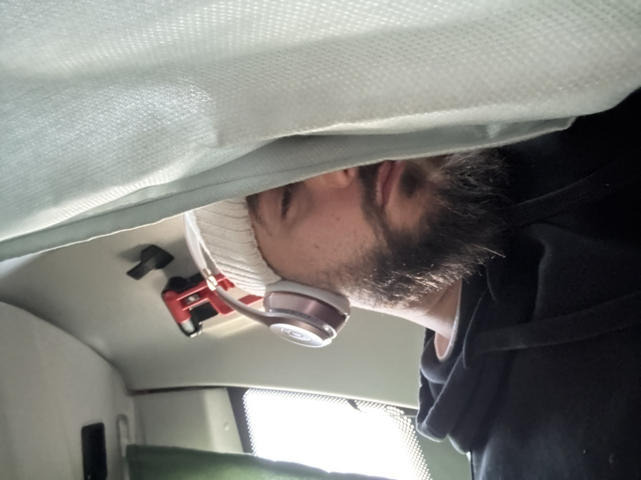 A man sleeps in what appears to be a vehicle. His head is against the roof, wearing a white hat and rose gold headphones. A gray curtain is overhead. A red device is attached to the roof near his head. He wears a dark hoodie. The window is visible in the background.