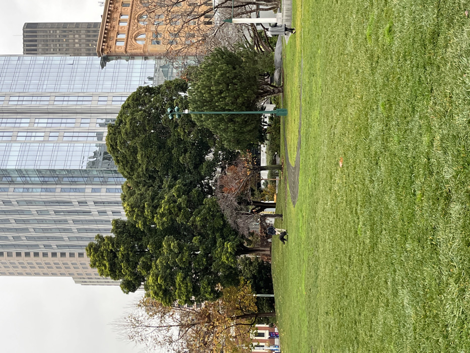A park scene unfolds with lush green grass dominating the foreground. Towering trees, some with dense green foliage and others more sparse, line the edge of the park. Tall buildings rise in the background, including a modern glass skyscraper and an older building with ornate detailing. A dark circular track is faintly visible on the grass. Several people are visible in the park.