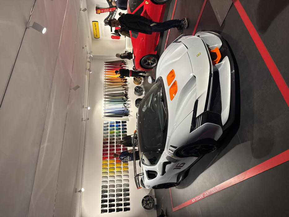 The scene depicts the interior of a brightly lit automotive showroom or museum in Maranello, Italy, likely the Ferrari Museum or a Ferrari Atelier