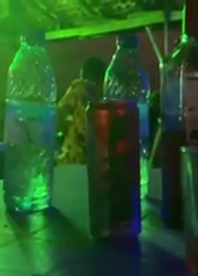 The video depicts a nighttime scene at an outdoor bar, with a table in the foreground covered in various beverages, including water bottles, a can of an energy drink, a bottle of liquor, and glasses containing liquid. The table itself appears to be plastic and is lit with green and blue light, possibly from nearby lighting fixtures. In the background, several people are seated at other tables, and a television screen is visible, suggesting a public viewing setting, maybe a sports game. Some LED strip lights are flashing in the background. The overall ambiance is relaxed, with the rhythmic sound of music indicating a lively atmosphere.