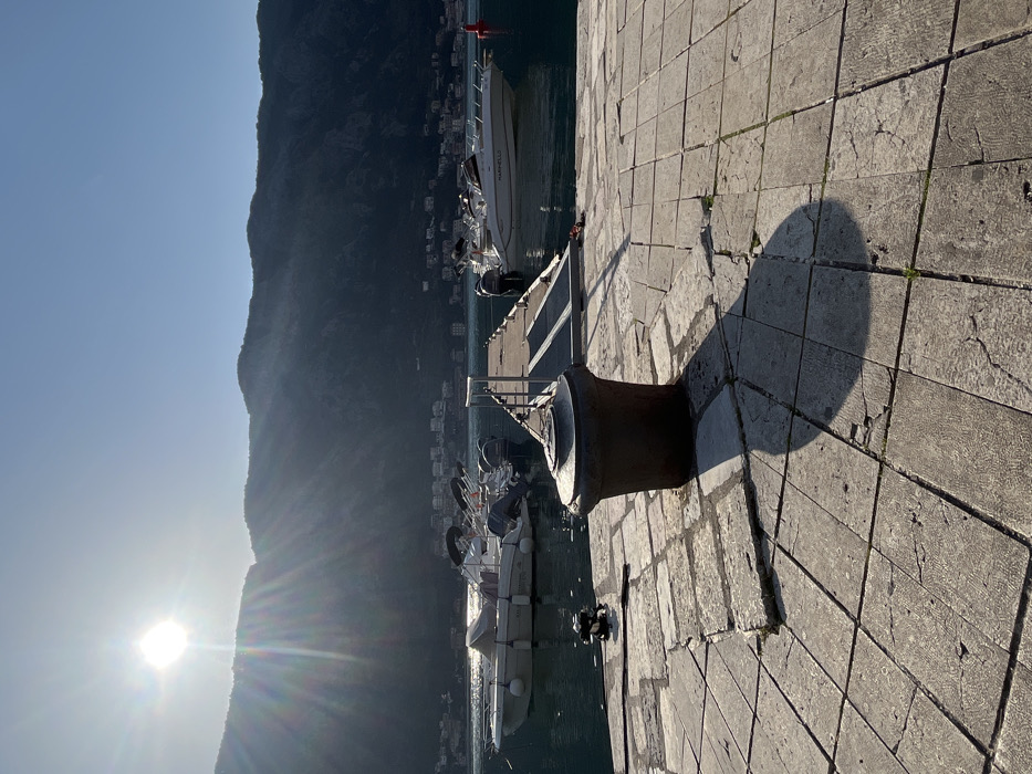 The image depicts a marina scene in Kotor, Montenegro, under bright sunlight