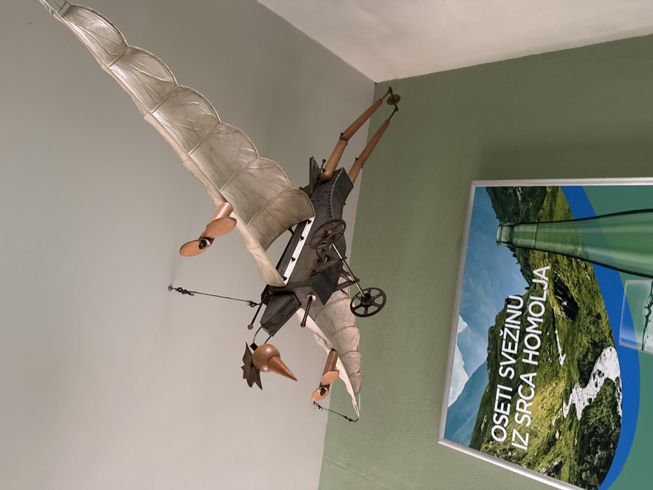 An intricate, steampunk-style kinetic sculpture, resembling a bird-like flying machine, is suspended from an off-white ceiling by a metal rod and wire. The sculpture features a wooden bird head with a prominent beak and spiky crest, wooden humanoid limbs (arms and legs), and large, ribbed, off-white fabric wings. Two small wooden propellers are positioned near the 'shoulders' of the wings. A central fuselage, dark in color, incorporates gears and two spoked wheels on its underside. The wooden legs extend downwards, ending in small wheels. Below and to the left of the sculpture, a large, framed poster is mounted on a light sage green wall. The poster depicts a mountainous landscape with a winding river, a tall green glass bottle, and a clear glass of liquid. Serbian text on the poster reads "OSETI SVEŽINU IZ SRCA HOMOLJA," translating to "FEEL THE FRESHNESS FROM THE HEART OF HOMOLJE." The wall to the right of the poster is off-white, forming an interior corner with the green wall. This scene is located within a building in the city of Subotica, Serbia.