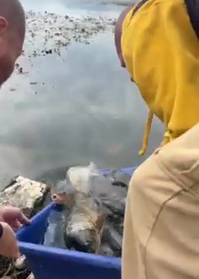 - "Two men are releasing fish into the water from a blue plastic bin" by FM-Y7YjE3, licensed under CC BY 4.0