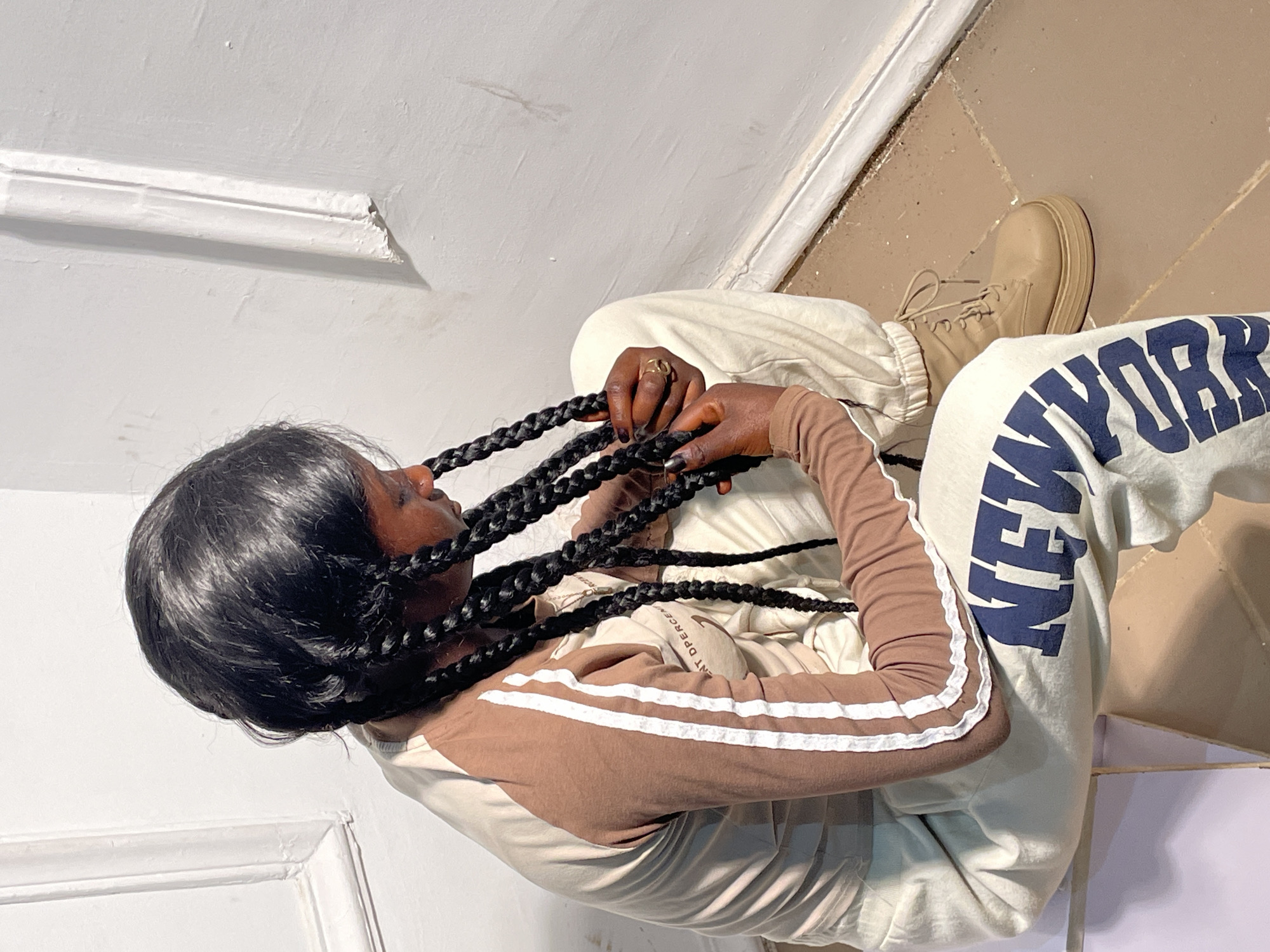 A dark-skinned individual is depicted seated indoors in Barakin Akawo, Nigeria, manipulating their braided hair. The subject wears a beige long-sleeved shirt with brown raglan sleeves featuring three white vertical stripes, light cream sweatpants with "NEW YORK" printed in blue on the left leg, and light tan lace-up boots with chunky soles. A gold-colored ring is visible on the right ring finger, and fingernails are painted dark. The individual's dark, long hair is styled in multiple braids. The background consists of white, textured walls with architectural molding details, including a damaged vertical trim piece on the right. The floor is composed of light brown/terracotta tiles with visible grout lines.