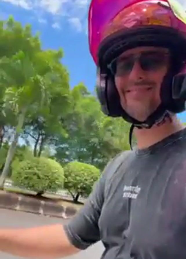 A man is riding a motorcycle in what appears to be a tropical location