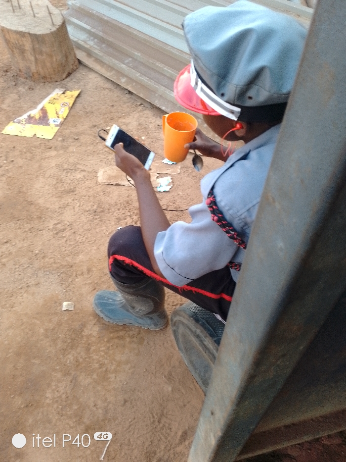 The image captures an individual seated outdoors on reddish-brown earth in Hoche, Nigeria. The person is viewed from the back-right, wearing a light blue short-sleeved shirt, dark pants with a red stripe along the side, and dark work boots. A grey cap is worn over a red hard hat featuring a white reflective strip. Orange wired earphones are inserted into the person's ears, connected to a white smartphone held in the left hand. The right hand holds an orange mug, which contains a silver spoon. A braided red and black strap is visible over the person's left shoulder. The background features stacked corrugated metal sheets and a vertical wooden log to the left. Discarded yellow packaging and other small debris are scattered on the ground. A dark metal structure partially frames the right side of the scene.
