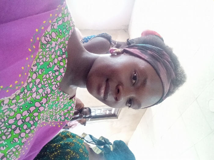 A dark-skinned female individual is depicted in a brightly lit indoor setting, positioned in the foreground and looking directly at the camera