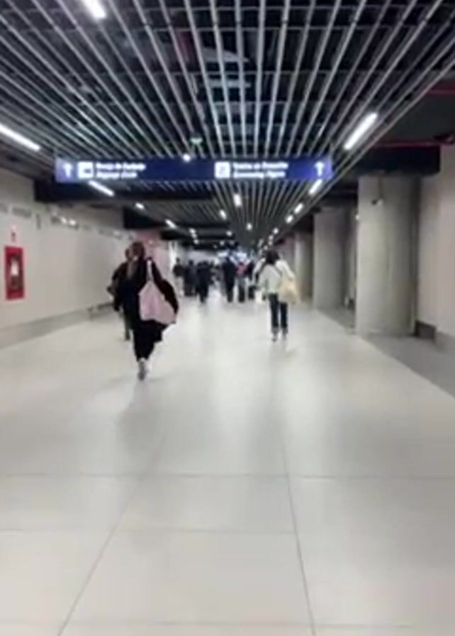 well-lit, spacious airport corridor with a modern design, possibly underground