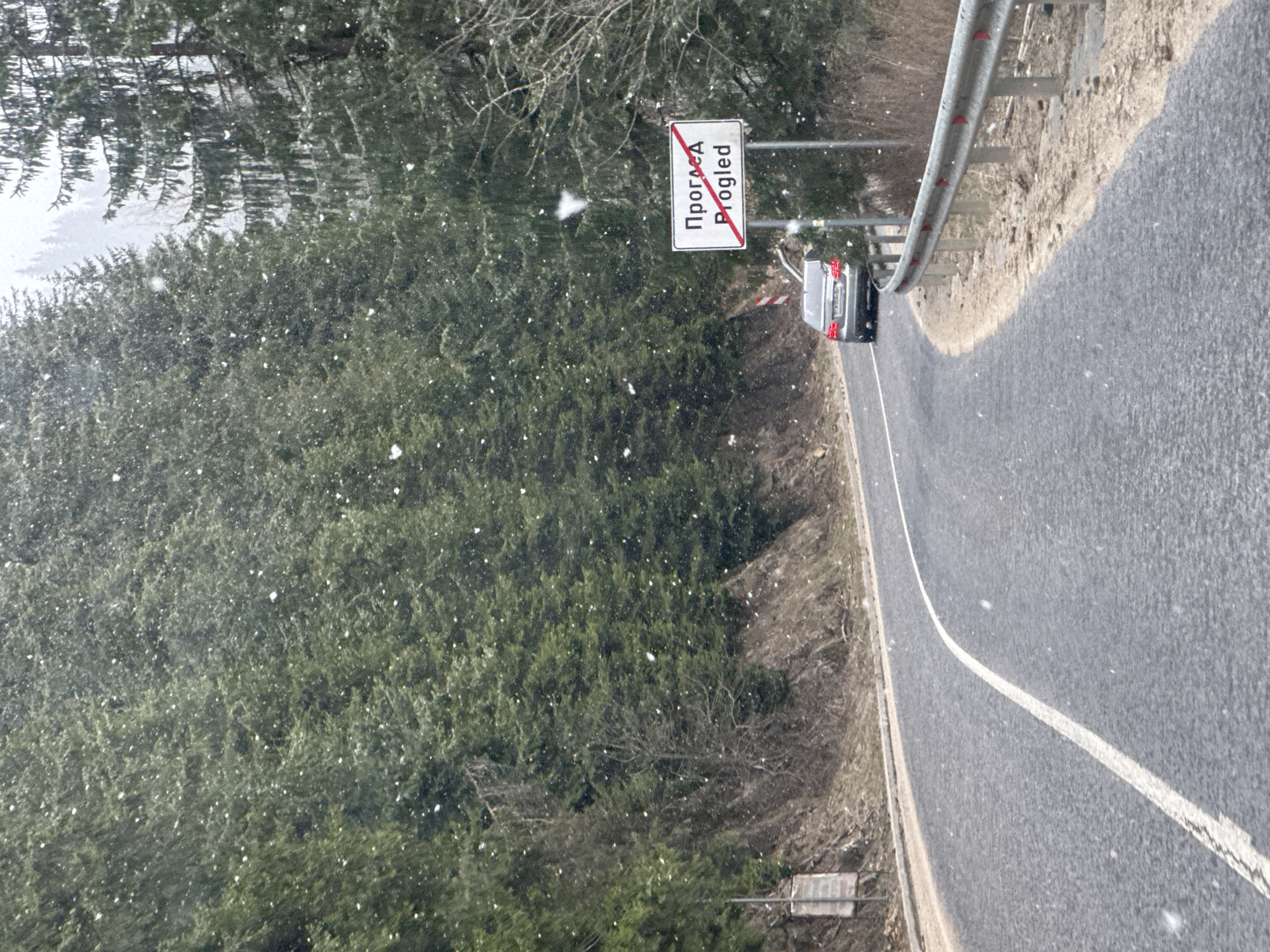 road outside Progled, Bulgaria during light snowfall. A gray car is traveling on the road, alongside a guardrail and a sign indicating the end of the Progled area. Dense forest lines the opposite side of the road.