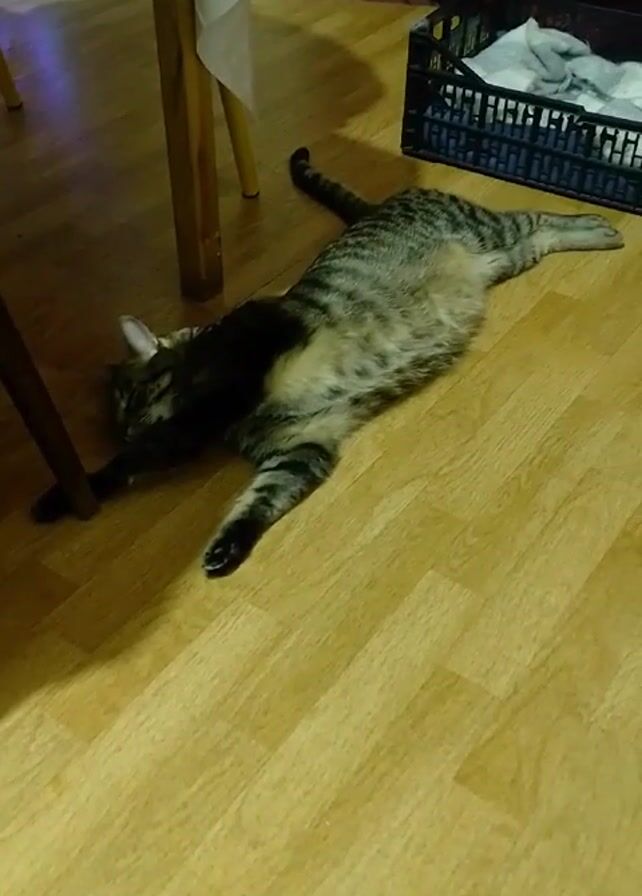 - "A tabby cat lies stretched out on a light-colored wooden floor, beneath a table covered with a white tablecloth" by FM-5n8Vg2, licensed under CC BY 4.0