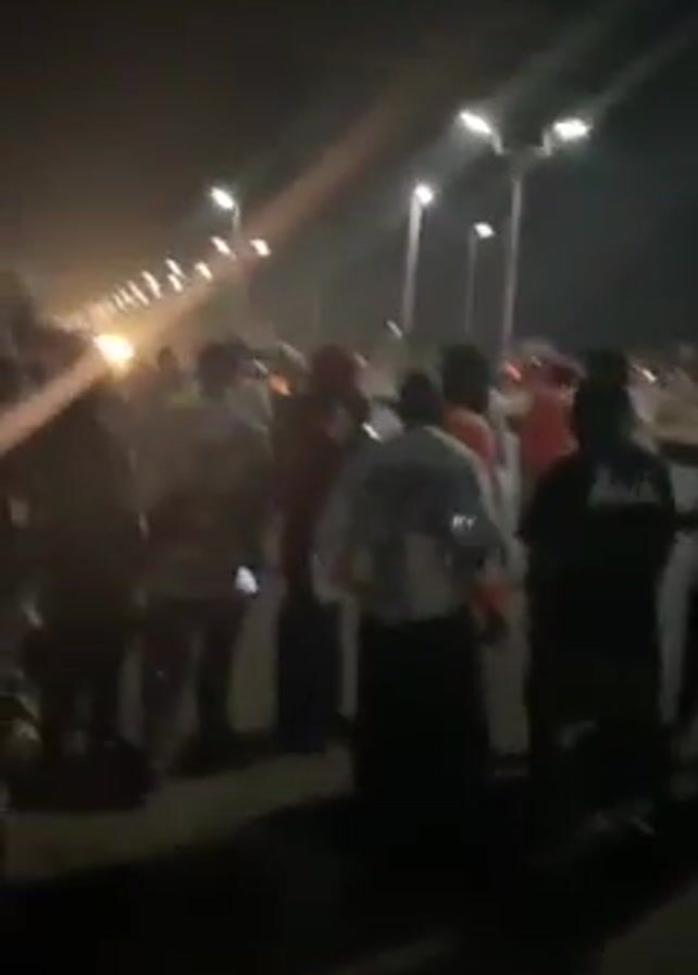 At night, a group of approximately 10 people, mostly young men, stand on what appears to be a wide, paved road or parking lot