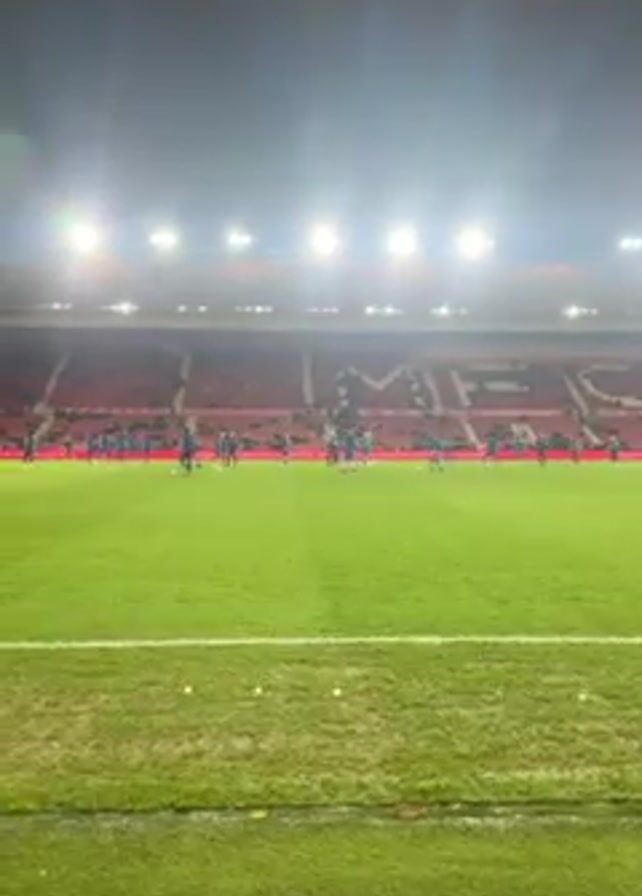 brightly lit soccer field at night. Several players in blue uniforms are scattered across the green pitch, some walking and others seemingly engaging in light practice. Behind them, the stands are partially filled with spectators. A white goal is visible at the edge of the field. The stadium is under bright floodlights, making the scene appear well-lit. The foreground shows the edge of the field, transitioning from the playing surface to a patch of grassy terrain.