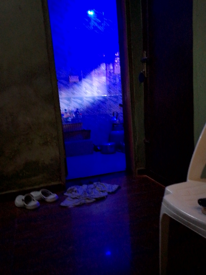 This image captures an interior scene in Nibo, Nigeria, viewed from a dimly lit room through an open doorway into an adjacent room illuminated intensely by blue light. In the immediate foreground, a dark, possibly reddish-brown floor is visible. To the left of the doorway, a pair of white, closed-toe shoes is placed neatly on the floor. Adjacent to the shoes and slightly further into the room, a crumpled light-colored cloth object lies on the floor. On the right side of the foreground, the upper portion of a white plastic chair is partially visible, with a dark, small object resting on its seat. The wall to the left of the doorway is dark and appears to have a rough texture. The doorway itself features a dark frame, and the dark-colored door is ajar to the right, revealing a latch mechanism. Beyond the doorway, the inner room is bathed in a bright, pervasive blue light, suggesting an artificial light source, possibly an LED fixture. Within this blue-lit room, objects are discernible but somewhat obscured by the light and atmospheric effects. These include what appears to be a white ceramic toilet or similar fixture on the far left, and various bottles and containers (possibly personal care products) on a surface or shelf. A metal pot or bowl is visible on the floor further into this room. The walls of this inner room appear to have a light-colored, possibly tiled or textured finish, reflecting the blue light. No individuals are visible in either room. The overall environment suggests an indoor domestic or commercial setting with distinct lighting choices.