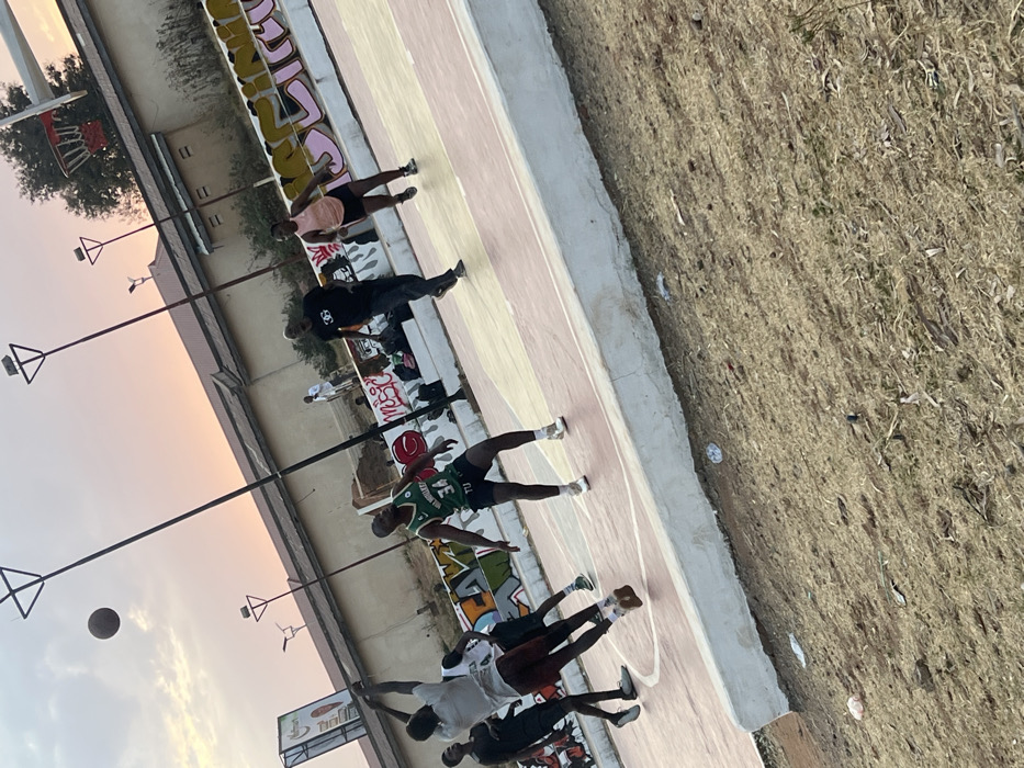 A group of young men are on a basketball court with graffiti on the bordering wall. They are positioned along the court's edge, possibly stretching or warming up. The setting appears to be outdoors, with a court adjacent to a grassy area. Several light poles are visible, and the sky is a muted orange, suggesting either sunrise or sunset.