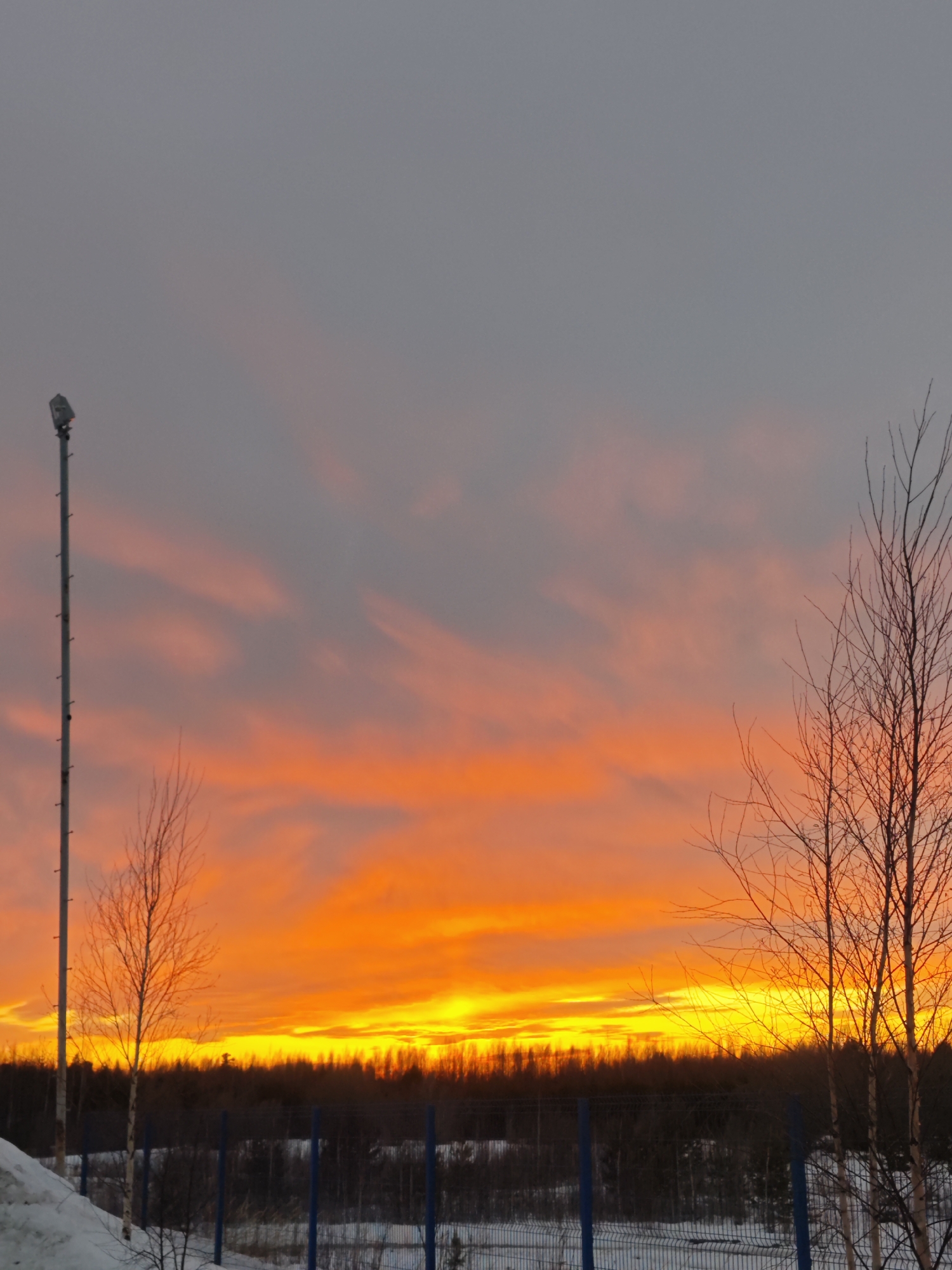 The image captures an outdoor scene at either sunrise or sunset in the city of Unknown, Russia. The sky dominates the upper two-thirds of the frame, transitioning from a grey-blue at the zenith to an intense, vibrant orange and yellow above the horizon. Patches of pink and orange-hued clouds are visible within the grey-blue and orange sky areas. On the left side of the frame, a tall, grey metal pole, possibly a floodlight mast, extends vertically upwards, capped with a dark luminaire fixture. Small, dark protrusions are spaced along the pole's shaft. Two bare-branched deciduous trees, characterized by thin trunks and fine branching patterns, are positioned in the midground; one stands centrally on the left, and another is partially visible on the far right. Both trees are silhouetted against the bright sky. The lower portion of the image reveals a snow-covered ground. On the far left, a snowdrift slopes downwards. A metal wire mesh fence with regularly spaced blue vertical posts runs horizontally across the midground, separating the immediate snow-covered area from a darker, snow-dusted expanse beyond it. In the background, a dense line of dark evergreen trees forms a distinct horizon, silhouetted against the brightest part of the sky. No individuals or specific actions are discernible within the scene.