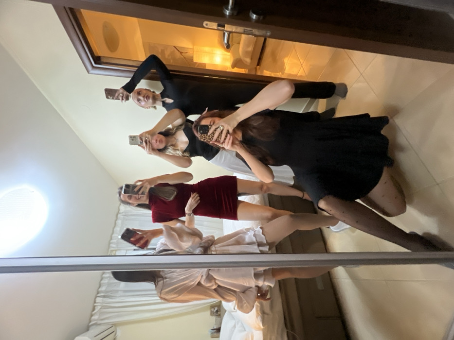 Four women are posing in front of a mirror, each holding a smartphone to take a picture. The first woman is wearing a long-sleeved black bodysuit. The second has blonde hair and is wearing a black top. The third is in a short red velvet dress. The fourth wears a loose-fitting light beige dress. The reflection behind them shows a room with a bed and a window with curtains. The mirror is framed with a dark wooden frame.