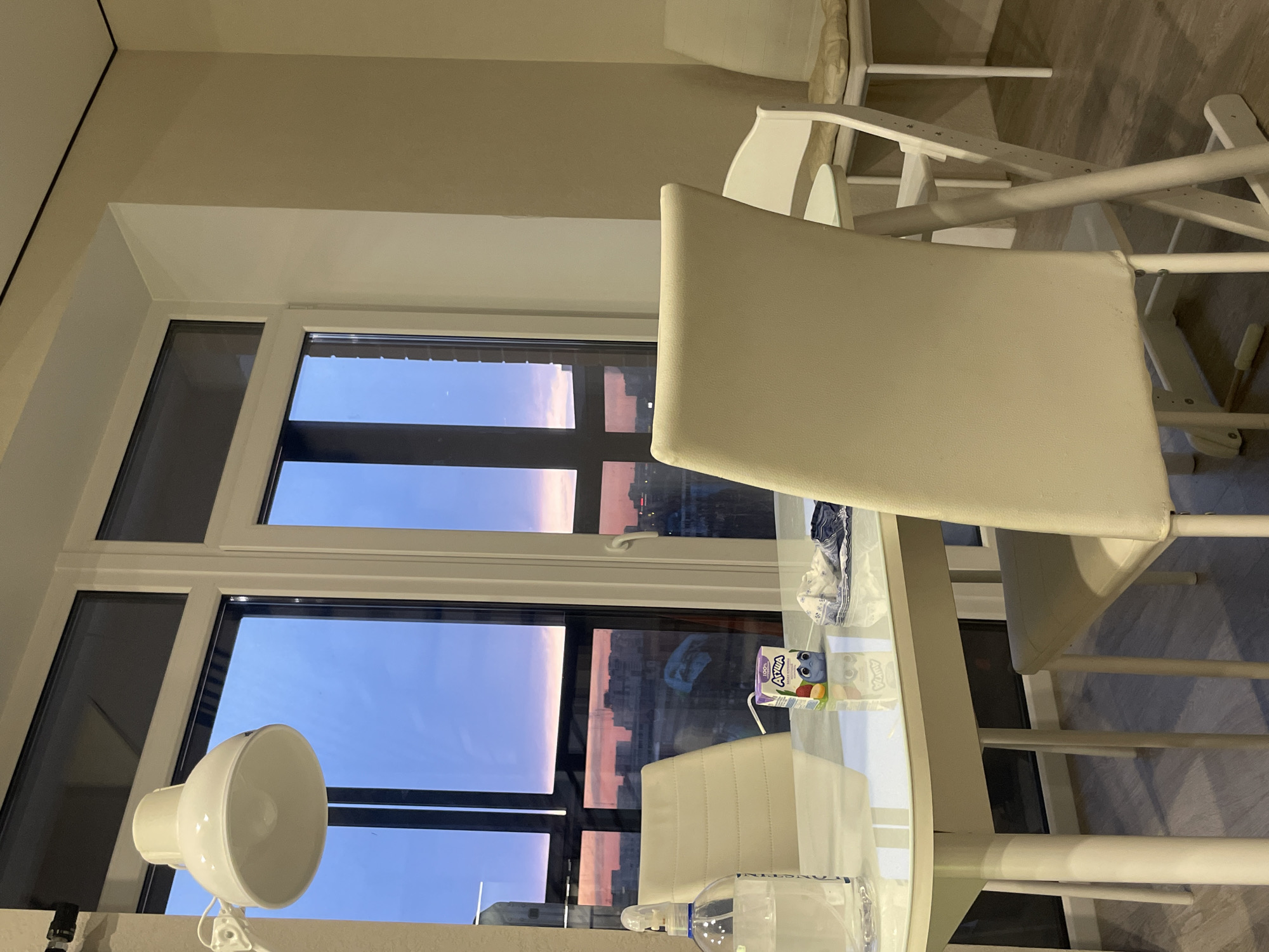 n interior view from a room, possibly an apartment, in Izhevsk, Russia, indicated by the cityscape visible through a multi-paned window. The sky visible outside the window suggests either dawn or dusk, with the sun rising or setting over the city. The window is fitted with white frames and horizontally oriented panes. In the foreground, there is a round, white table, which is partly visible. On the table, there are several objects including a small carton of juice featuring a cartoon character. There's also a clear spray bottle containing a liquid. To the left, there's a white lamp with a reflector-style shade, clipped to the edge of the table. Several white chairs are positioned around the table, with one chair's back prominently in the frame. The chair has a padded seat and back. Another chair, possibly a high chair, is partially visible in the background. The overall impression is of a domestic scene, possibly a kitchen or dining area, with a view of the cityscape of Izhevsk. The style is modern and minimalistic.