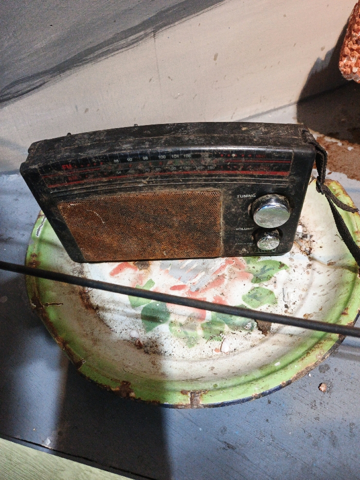 An old, dusty, black radio sits atop a worn, green-edged enamel plate