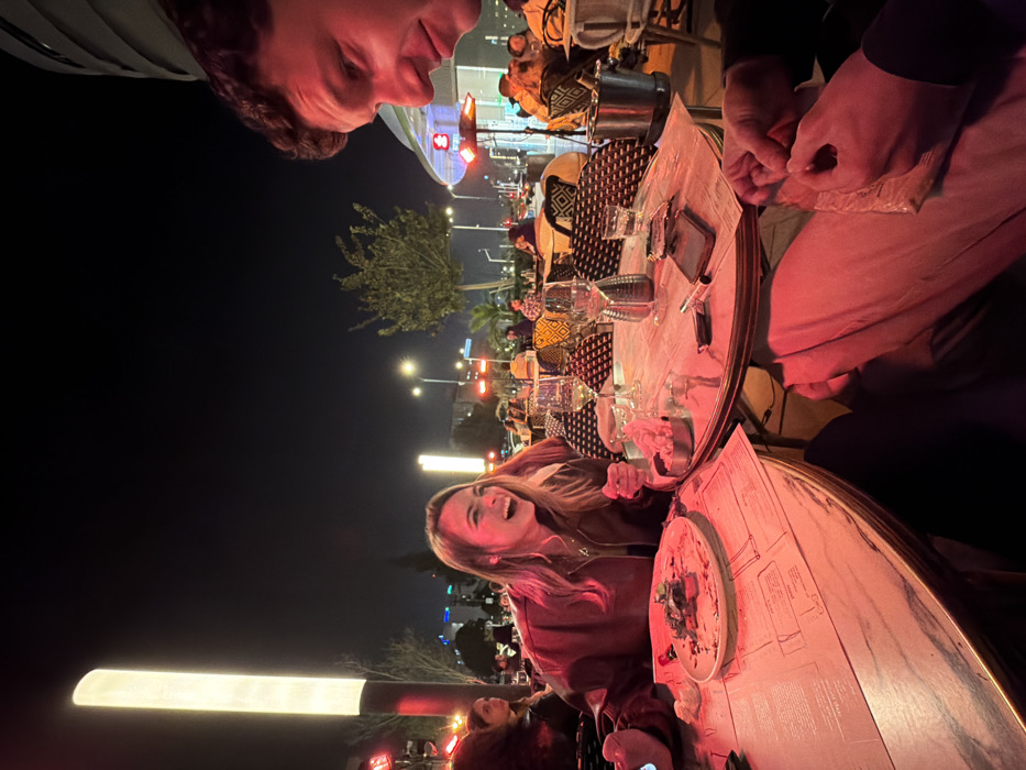 A nighttime outdoor restaurant scene. A woman smiles at the camera from a table with a half-eaten plate. Another person's face is partially visible at the top. Additional tables, patrons, and city lights form the background. A man's hands are seen above the table next to them. The scene has a warm, reddish glow, possibly from a nearby heater.