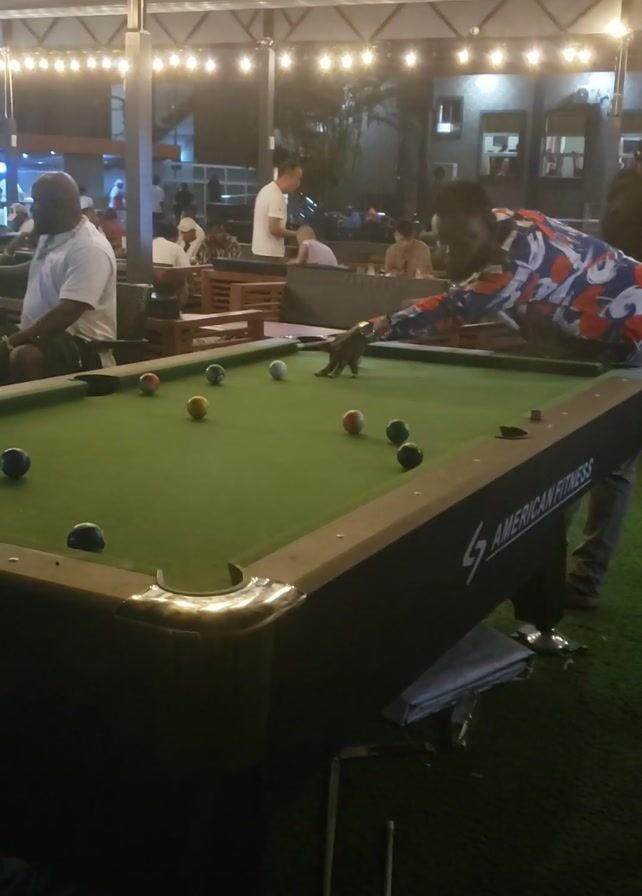- "A low angle shot captures a person in a brightly patterned shirt playing pool on a green felt table outdoors under string lights" by FM-vXzHq2, licensed under CC BY 4.0
