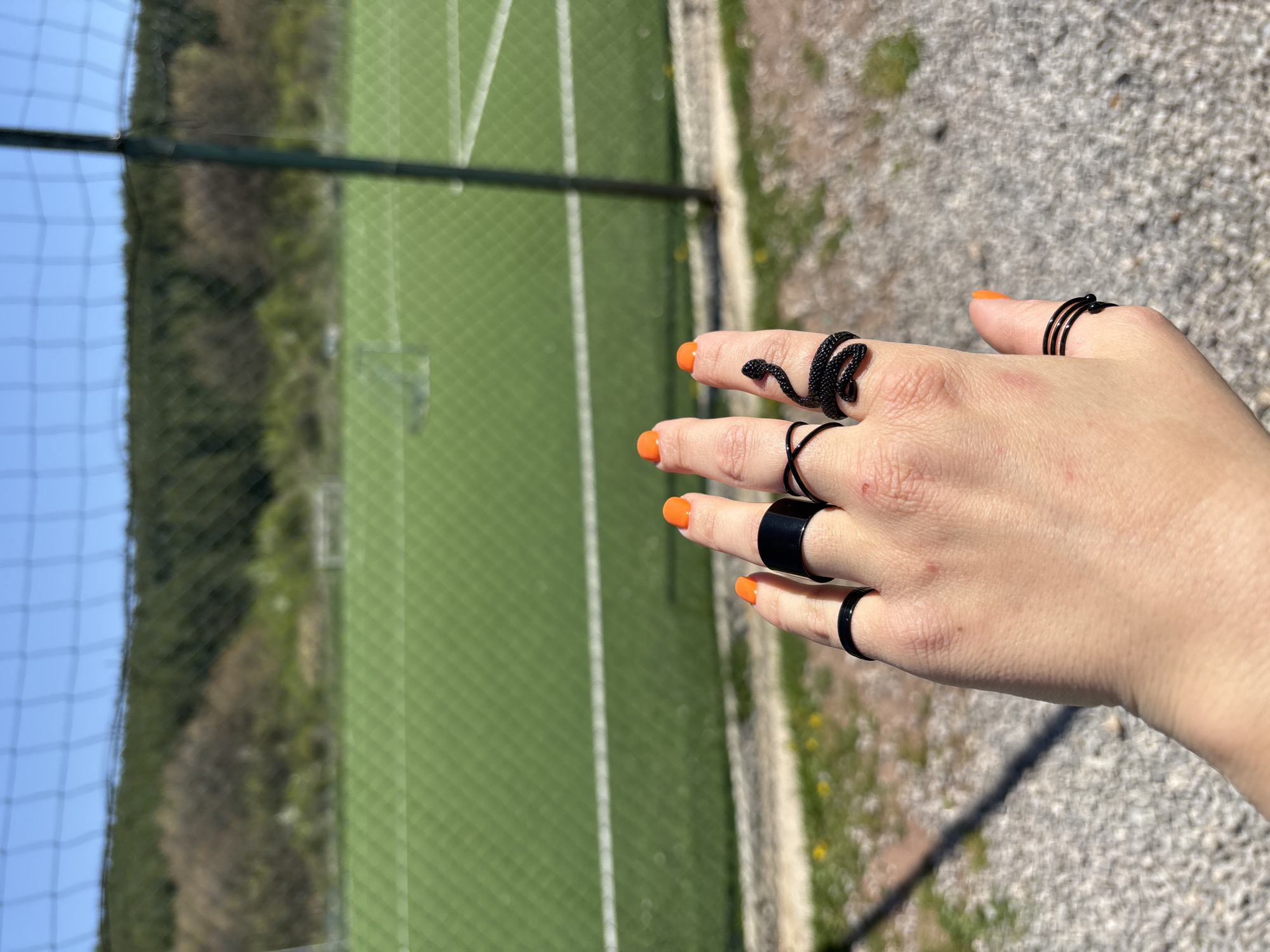 The image depicts a right hand with orange nail polish and various black rings, positioned against a backdrop of a grassy sports field enclosed by a net. The rings include a snake-shaped ring, a ring with crisscross patterns, a wide band ring, a multi-band ring, and a simple thin band ring. The ground surrounding the field appears to be gravel. The photo was taken during the day, with sufficient natural light. There is no definitive evidence within the image to confirm that it was taken in Pernik, Bulgaria.