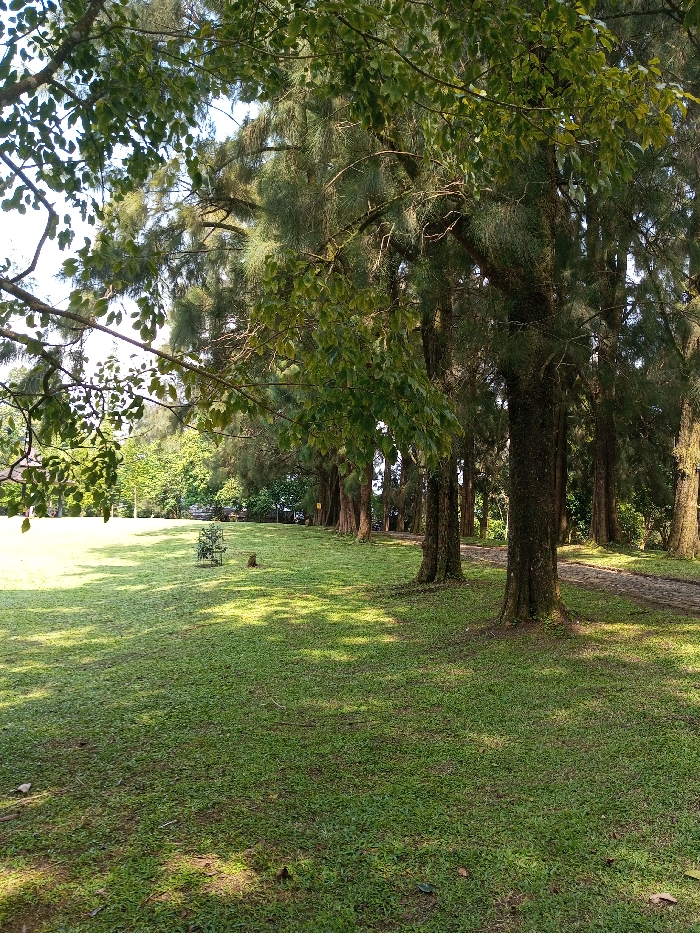 The image displays a daytime outdoor scene located in New Serchhip, India, featuring a prominent grassy expanse on the left and a dense tree line on the right. The grass is consistently cut green, exhibiting areas of sunlight and distinct elongated shadows across its surface. A small, bushy green shrub, approximately 0.5 meters in height, is centrally positioned on the grass, with a dark, low-lying object situated to its immediate right. A row of tall, mature trees, exhibiting both needle-like and broadleaf foliage, delineates the right side of the frame. Their dark, textured trunks are visible, supporting dense green canopies. A narrow, unpaved or stone-paved path runs along the base of these trees. In the distant left background, partially obscured by foliage, faint outlines of structures and a white vehicle are discernible. The sky, visible through gaps in the upper canopy, appears bright. No individuals are present in the scene.
