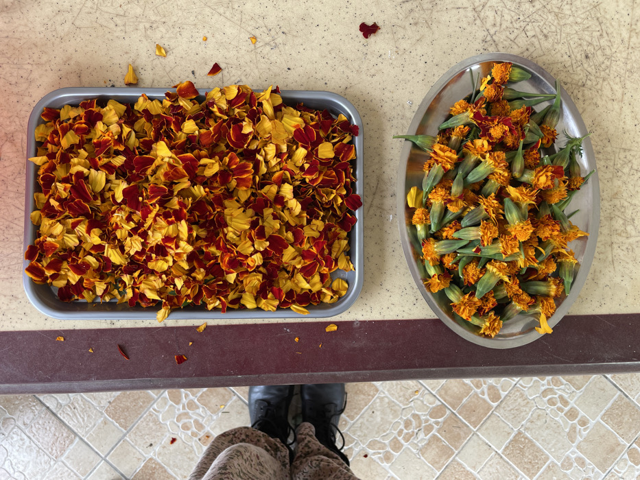 An overhead view captures a scene with marigold flowers. Two silver-colored metallic trays rest on a light-colored, scratched surface. The upper, rectangular tray is filled with numerous loose marigold petals, displaying a primary yellow color interspersed with red-orange accents. The lower, oval tray contains multiple intact marigold flower heads, primarily orange and yellow with green calyxes and short stems. A few individual red and yellow petals are scattered on the light-colored surface and on a dark red-brown border situated to its left. Adjacent to this border, on the far left, a section of tiled floor with beige and light brown geometric patterns is visible. On this tiled floor, the lower legs and dark lace-up boots of an individual, wearing patterned fabric trousers, are partially present. The exact location within Danilovgrad, Montenegro, is not discernible from the provided visual evidence. No active interactions or explicit actions beyond the arrangement of flowers are depicted.