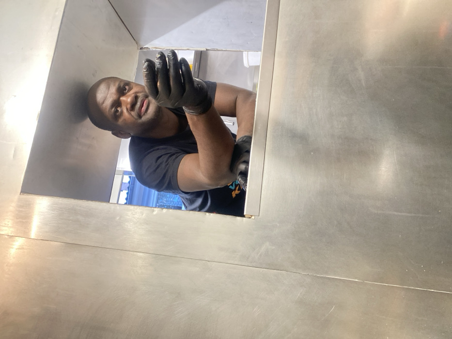The image captures an adult male within a rectangular pass-through opening of a brushed stainless steel partition, in what appears to be an indoor commercial setting located in Schiltigheim, France
