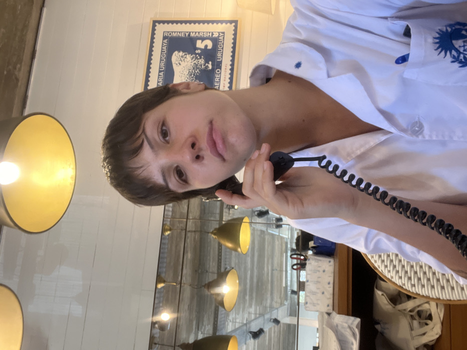 A person holds a black telephone receiver to their ear, their face angled towards the camera. They are wearing a white collared shirt. Behind them is a wall decorated with a framed stamp and a mirror reflecting multiple pendant lights. White walls and a glimpse of a wicker chair are also visible. The lighting is warm, highlighting the lamps and creating a reflective environment.