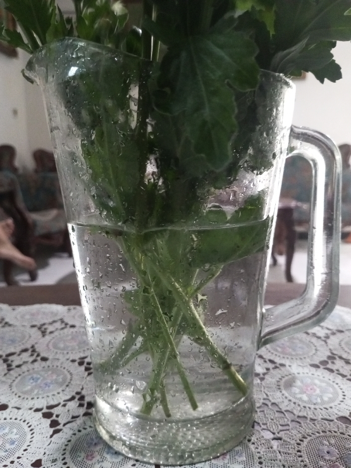- "A clear glass pitcher, containing water and multiple green plant stems with foliage, rests on a table covered by a patterned light-colored textile" by FM-YZcKc2, licensed under CC BY 4.0