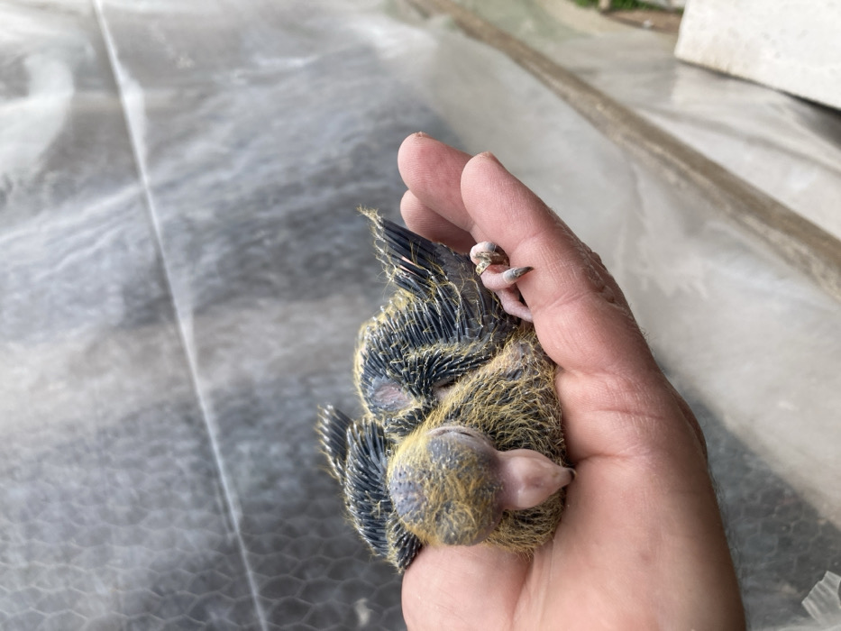 - "The image displays a nascent bird, identified as a pigeon squab, situated within the open palm of a human's right hand" by FM-ccz603, licensed under CC BY 4.0