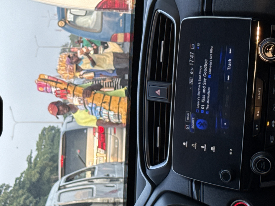 car's dashboard display. The screen indicates that the radio is playing "01 Kiss and Say Goodbye" by The Manhattans from "Legacy's Rhythm & Soul Revue." It's 17:47, and the signal strength is "Lo" with 15 bars. Outside the car window, people are selling goods in what appears to be a busy street scene with vehicles. There are street vendors carrying stacks of what seem to be packaged items, with other cars visible in the background.
