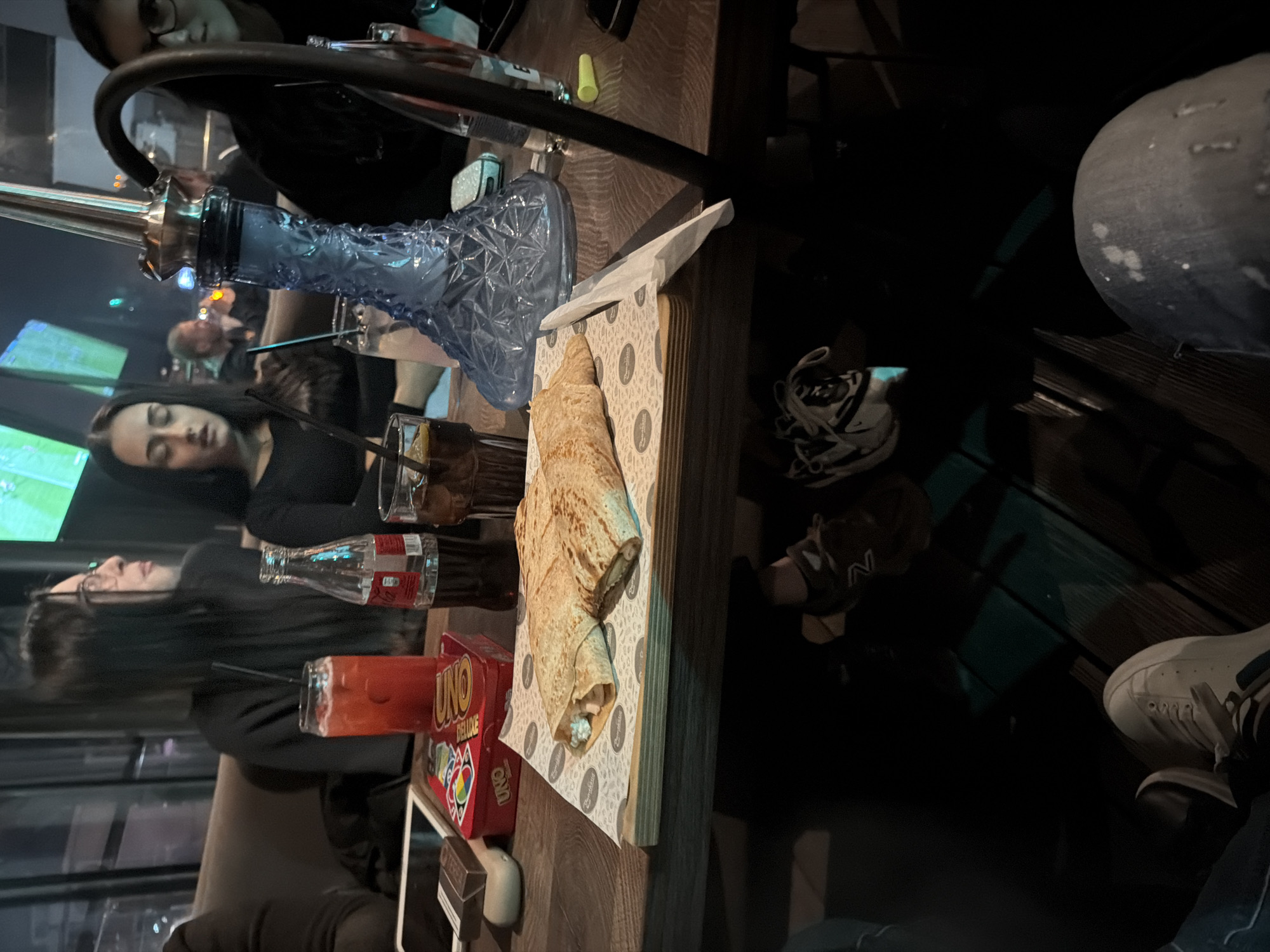 The image displays an indoor night scene from a dimly lit establishment, identified as a cafe or lounge in Sofia, Bulgaria, based on the Cyrillic branding "Запеканка" (Zapecanka) on the food wrapper. The central focus is a dark wooden table covered with food, drinks, and personal items. Two folded flatbread wraps with white filling are presented on a small wooden board lined with branded paper. Several beverages are visible: a tall glass containing a red iced drink with a straw, a glass bottle of Coca-Cola, a glass with a dark beverage and ice, another glass with a lighter-colored drink behind a hookah, and a glass with a dark drink and a lemon slice to the far right. A prominent blue, textured hookah with a dark hose stands centrally on the table. Additional items on the table include a red "UNO" card game box, a white tablet, a dark rectangular electronic device, a small white oval object (possibly an earbud case), a folded white paper, a bright yellow plastic hookah mouthpiece tip, and a dark mobile phone. At least five individuals are present. In the mid-ground, a woman with long dark hair and glasses is seated on the left, looking to the right. Next to her, another woman with long dark hair looks downwards or away from the camera. A third woman with glasses is partially visible on the far right. Two indistinct male figures are seated in the blurred background. Large, illuminated screens in the background display what appears to be a football match. The perspective is from a seated position, with white sneakers belonging to the photographer visible in the immediate foreground, and other footwear (brown sneakers, white and black sneakers) visible on the floor beneath the table.