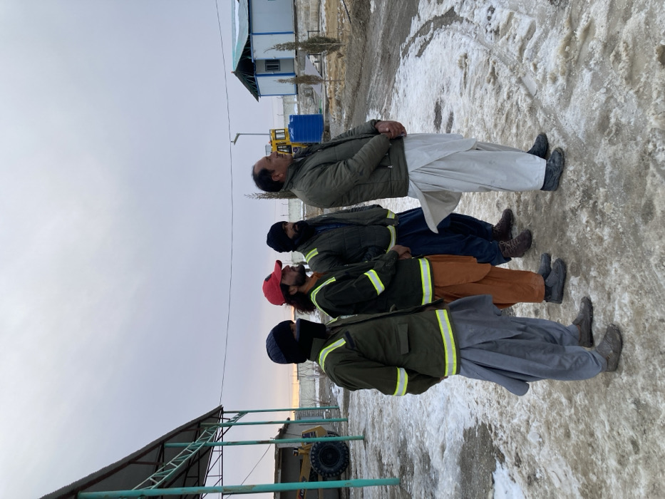 Four adult males stand in a line on a snow-dusted, muddy ground under an overcast sky at a construction or temporary facility site in Kan Mehtarzai, Pakistan