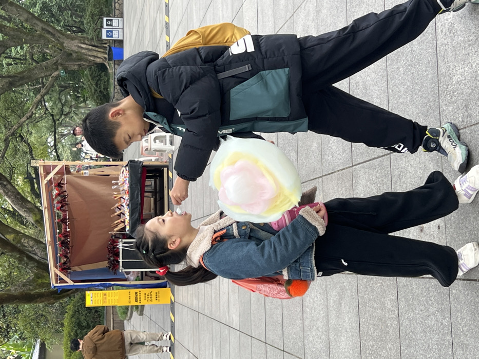 A boy and girl are sharing a large cotton candy on a paved area near a stall. The boy, wearing a black puffy coat and black pants, feeds the girl, who wears a denim jacket and black pants. The cotton candy is large and multi-colored, with yellow and pink hues. In the background, there is a stall selling various items, and a sign with yellow text. Trees line the periphery of the shot.