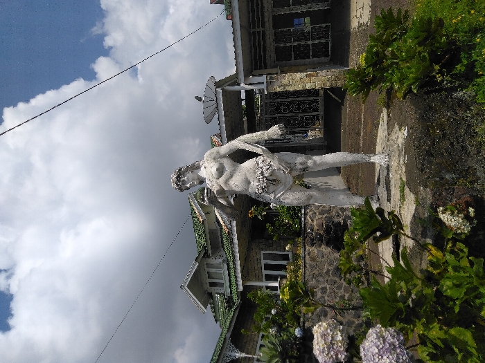 An outdoor, daytime image captured in Nathene, Laos, features a weathered, light-colored female statue positioned centrally in the foreground. The statue, standing on a concrete base, is partially draped with fabric around its lower body, holding a spherical object in its right hand near the chest and a draped cloth in its left hand. Behind the statue, a multi-level building with a distinctive green-tiled roof, white walls, and a stone foundation is visible. The building exhibits multiple windows, a porch with white railings, and a dark satellite dish mounted on the roof structure to the right. The immediate foreground is populated with various green plants, including clusters of light purple/white hydrangeas on the left. The upper portion of the scene shows a sky with significant white cumulus cloud cover and patches of clear blue sky. A dark utility line crosses the sky diagonally from the upper left. No human figures are present.