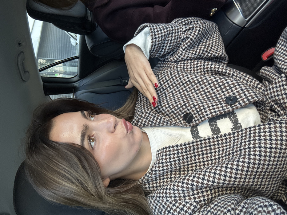 The image depicts a young adult female occupying the front passenger seat of a vehicle in Loures, Portugal. She has medium-brown hair with lighter highlights framing her face, brown eyes, and is looking towards the right side of the frame with a puckered-lip expression. Her left hand, with red-painted fingernails, is raised to chest level, palm facing inward. She is wearing an off-white crew-neck sweatshirt with a dark graphic design, overlaid by an open brown, black, and white houndstooth pattern jacket with two visible black buttons. The car's interior features black leather seating. A person in a dark maroon/brown coat with a visible gold button is seated in the rear passenger seat, partially obscured behind the primary subject. Through the car windows, a blurred urban environment is visible, including parts of buildings, possibly with roller shutters, and hints of parked vehicles and trees, indicating a city street scene during daylight.