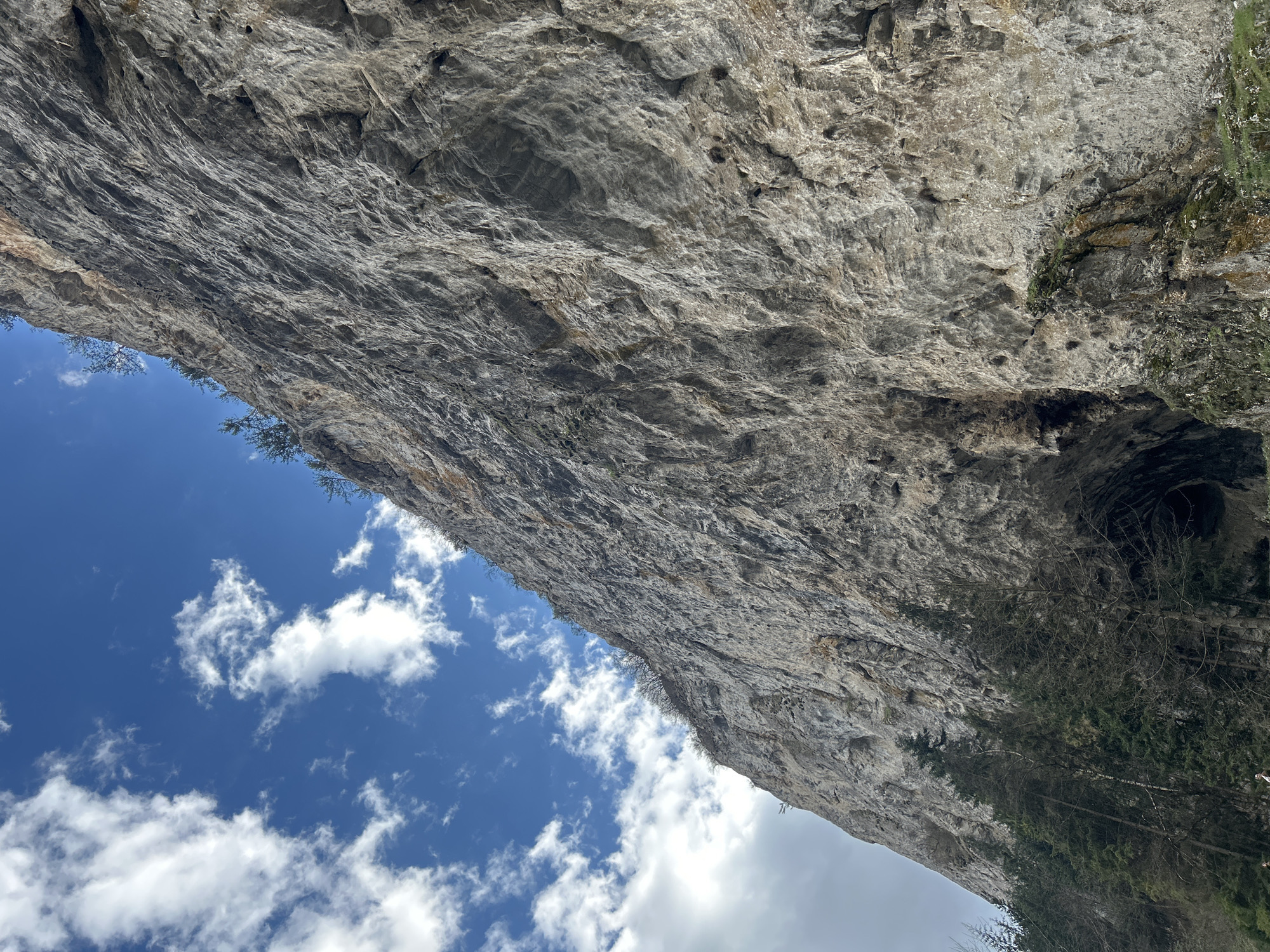 The image presents a dramatic view upward towards a towering rock formation or cliff face. The sky is visible in the lower left portion of the frame, filled with fluffy white clouds set against a deep blue backdrop. This juxtaposes with the rugged, textured surface of the rock, which dominates the majority of the image. The rock is composed of light gray stone with cracks, crevices, and variations in color and texture. There are some trees growing around the rock face, particularly on the right side, some of them with green foliage. There appears to be a cavernous opening or a dark recess within the rock on the upper right side. The location is assumed to be Iagodina, Bulgaria, given the prompt, though the image itself contains no location markers.
