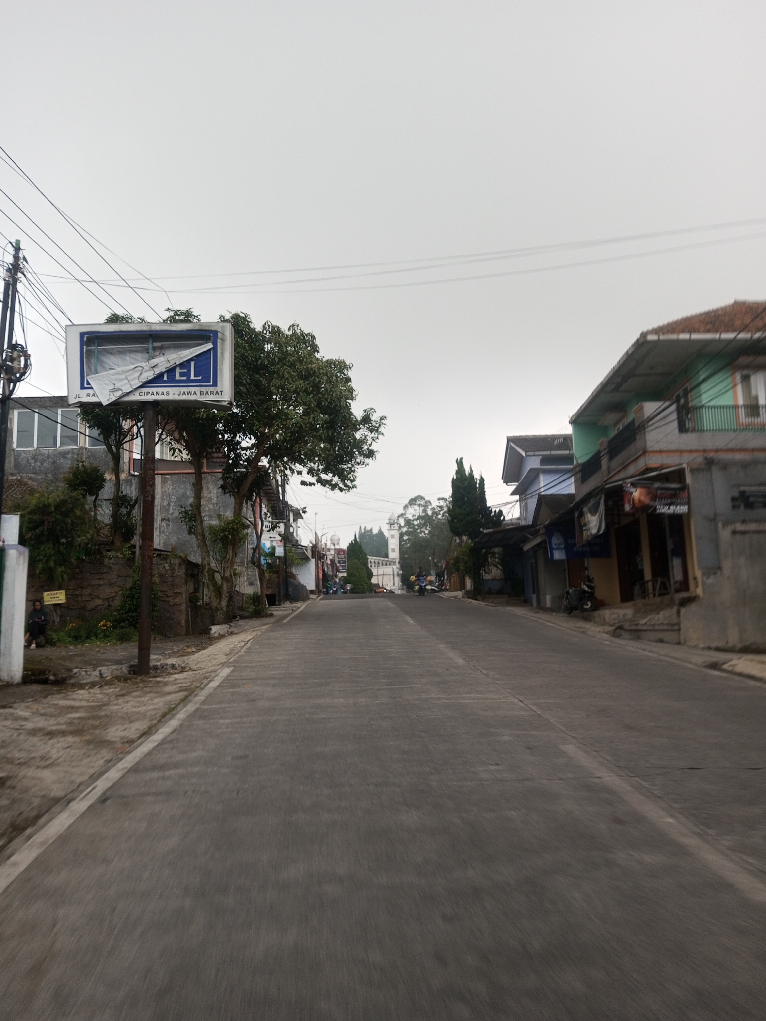 The image presents a straight, paved two-lane road receding into the distance under an overcast sky within the designated city of Kan Beit, Myanmar. A damaged billboard on the left side of the road, however, visibly displays text including "CIPANAS - JAWA BARAT," which identifies a location in Indonesia. On the left, a utility pole with multiple overhead wires stands in the foreground. Below it, the aforementioned rectangular billboard, blue and white with a torn white fabric hanging, is mounted on a pole. Partially visible text includes "...EL" (likely "HOTEL") and "JL. RA... - CIPANAS - JAWA BARAT." A retaining wall covered in vegetation runs behind the billboard. A person, seated on the ground with their back against a small white structure, is visible near the base of the wall. Several trees are present along this side. The right side of the road is lined with two-story commercial or residential buildings. The nearest structure has a reddish-brown tiled roof, a light green upper floor with a small balcony, and a grey lower section. Subsequent buildings display varying facades, including blue and light brown, with some featuring awnings. Several motorbikes are parked further down this side. In the distance, a prominent white building with domes and a spire, possibly a mosque, is discernible. The road surface is asphalt or concrete, with a faint white line marking the shoulder on the left side.