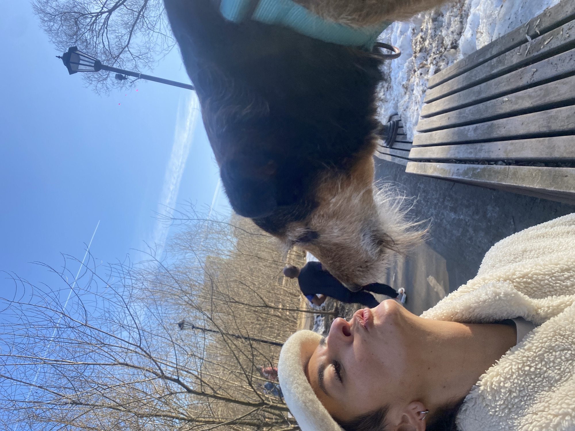A woman is reclining on a wooden park bench. A large dog with dark fur and a light blue harness stands over her, possibly interacting with her face. A person in dark clothing is walking on a path behind them. Bare trees line the background. A lamppost is visible among the trees. Patches of snow are visible on the ground near the bench. The sky is bright blue with some contrails. The scene likely takes place in a park in Moscow, Russia.