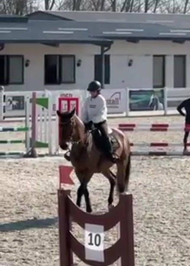 In an outdoor scene on a sunny day, a woman wearing a helmet and light-colored sweatshirt rides a brown horse in an arena set up for equestrian jumping. The horse and rider are positioned near a brown jump marked with the number "10". They are in the foreground of the shot, with other horses and riders visible in the background. The arena is covered in sand or gravel. A white building with a dark roof is in the background, along with several sponsors signs. The camera is static, maintaining a steady view of the horse and rider.