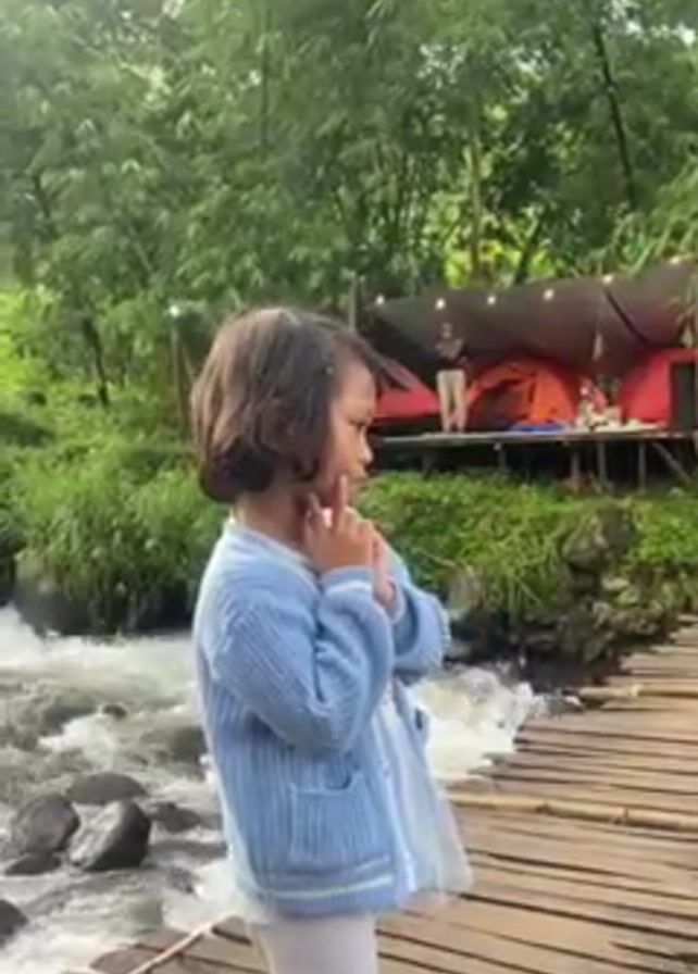 A small girl stands on a wooden plank bridge over a river. The girl has short brown hair, wears a blue cardigan over a white dress, and light colored pants. She rests a finger against her cheek and appears to be looking to her left. Behind the girl, across the river, is a platform upon which two orange tents are set up under an awning. There are several people on the platform. The river flows rapidly around rocks. The surrounding area is green with trees and foliage.