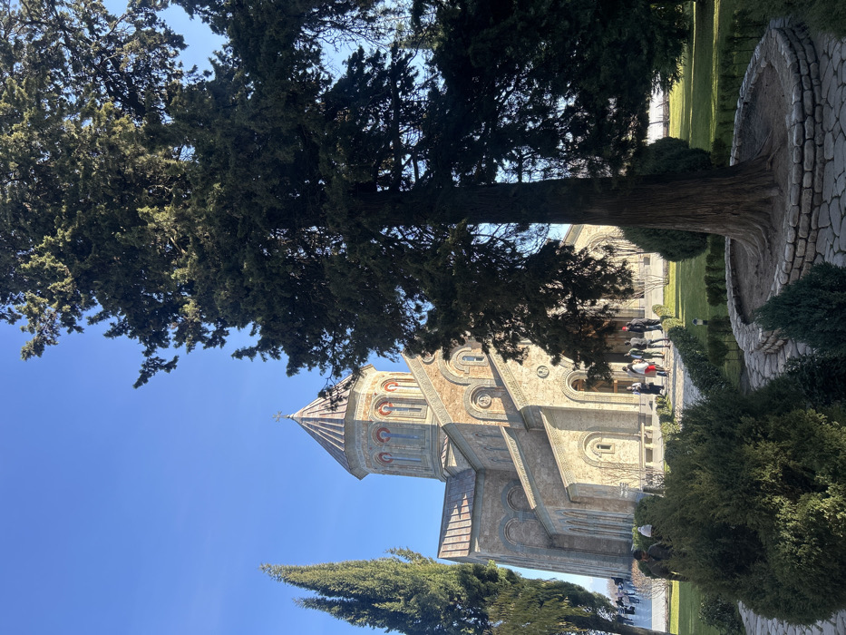 The image captures the Bodbe Monastery, specifically St. George's Cathedral, situated near Sighnaghi, Georgia, under a clear blue sky. The cathedral is constructed of light-colored stone, featuring an octagonal dome topped with a conical, weathered copper-toned roof and a cross. Its facade displays arched windows with red trim and intricate stone detailing. A prominent, large evergreen tree with a thick trunk stands on the right in the foreground, partially obscuring the church; its base is enclosed by a low, circular stone wall. A winding stone pathway leads through a manicured garden with various green shrubs and grass toward the cathedral. A group of approximately 10-15 individuals, dressed in casual clothing, are gathered on the steps and paved area directly in front of the cathedral's main entrance. Additional people are visible in the distant left background. Tall, slender evergreen trees are visible on the far left. Sunlight illuminates the scene, casting discernible shadows.