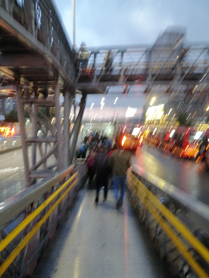 A blurry, eye-level view from a pedestrian bridge. People walk forward, while vehicles with bright headlights streak by on the road below. The bridge's metal structure and yellow railings are prominent. The sky is overcast. The scene is dynamic, with blurred motion suggesting a moving camera or subject.