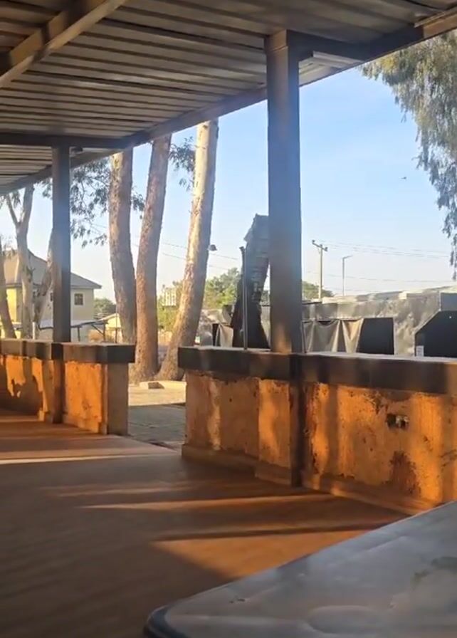 The video presents a static shot from under a metal-roofed outdoor structure, revealing an outdoor area with a concrete floor