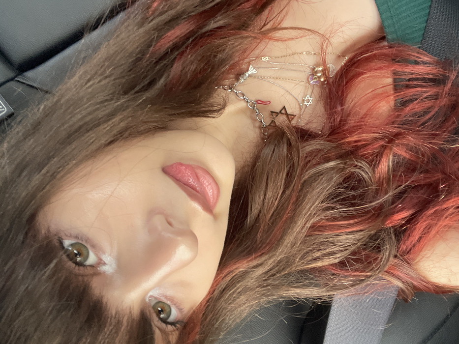 A woman tilts her head towards the camera. She has brown hair with red highlights and bangs. Her skin is fair with visible makeup. She wears several delicate necklaces, one with a Star of David pendant. She is positioned in what appears to be a car seat. The lighting is soft and flattering, highlighting her features. The overall impression is casual and intimate.