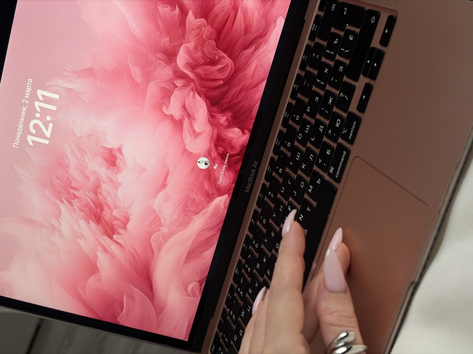 A forensic examination of the image reveals a close-up perspective of a human left hand interacting with a rose gold/copper-toned MacBook Air laptop, situated in the city of Novosaratovka, Russia