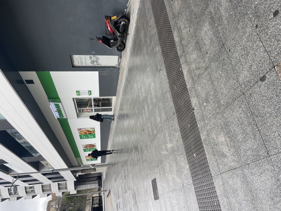 - "The image depicts a ground-level view of a contemporary urban street in Eibar, Spain, characterized by a wet, gray tiled sidewalk under an overcast sky" by FM-ekT8x1, licensed under CC BY 4.0