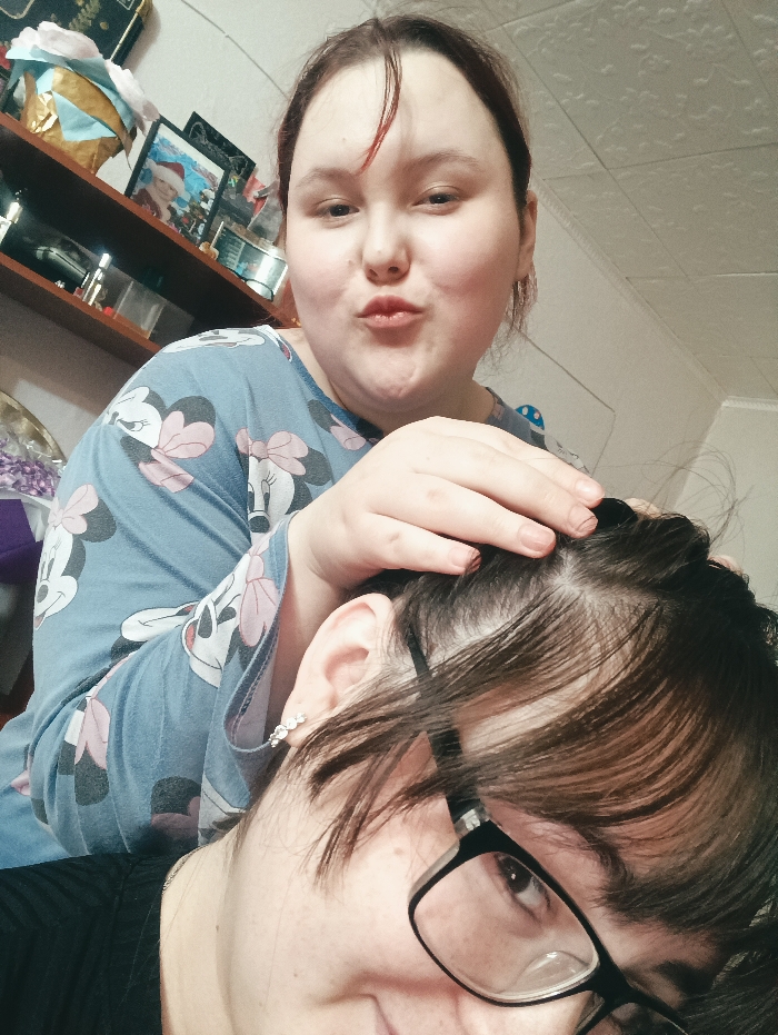 Two people appear in a selfie, with one person behind the other. The person in front is wearing black-rimmed glasses and a black top. They are smiling slightly. The person behind them is wearing a blue top with Mickey Mouse prints and has their hand on the front person's head. This person is also making a kissing face. A shelf cluttered with various items is visible in the background. The ceiling has textured tiles.