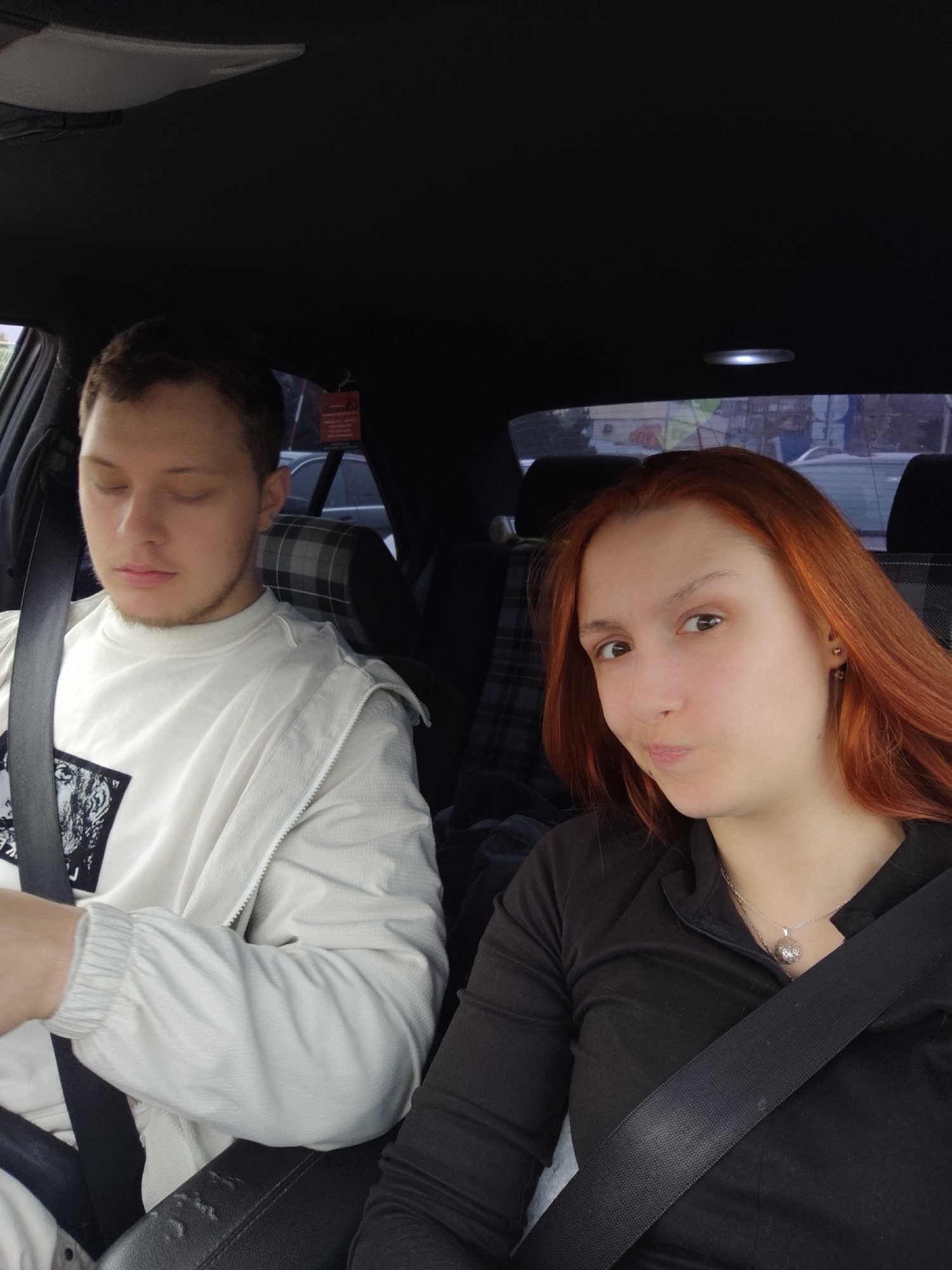 Two people are in a car. On the left, a man with short brown hair and closed eyes wears a white jacket and is secured with a seatbelt. On the right, a woman with red hair wears a black top, a necklace, and is also wearing a seatbelt. The interior of the car is visible with black upholstery and a plaid pattern on the seats. Through the car windows, a blurred cityscape is visible. Given the information provided, I am unable to give details about the location in the city of Vratsa, Bulgaria.